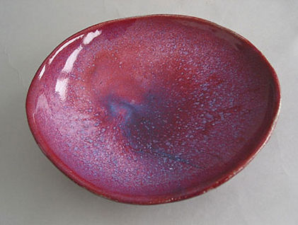 This bowl is made by draping the slab of clay over a softly shaped smooth stone. The deep red glaze with cobalt overtones is achieved by reduction firing in a gas kiln.